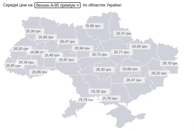 Так, сегодня утром самым дешевым литр бензина А – 95 Premium был в Сумской области – 25,31 грн, а самым дорогим в Житомирской - 26,47 грн.