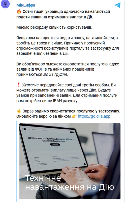 На данный момент, как сообщает пресс-служба Министерства цифровой трансформации в Telegram-канале, портал государственных услуг «Дия» и одноименное мобильное приложение для оцифрованных документов испытывают трудности с обработкой рекордного количества заявок от претендентов на получение 8 тысяч гривен единовременной помощи от государства. Уточняется, что сотни тысяч украинцев одновременно пытаются подать заявления на получение выплат в «Дия», однако, как оказалось, у портала и приложения низкая пропускная способность.