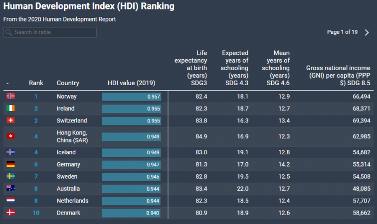 Так, всего в рейтинг входит 189 стран. Первые три места заняли: Норвегия, Ирландия и Швейцария. Также в десятку стран с самым высоким коэффициентом человеческого развития вошли: Гонконг, Исландия, Германия, Швеция, Австралия, Нидерланды и Дания.