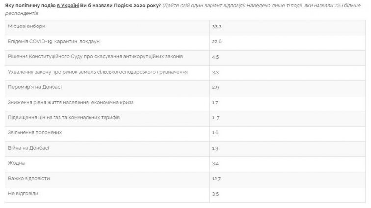 А «Главным политическим событием 2020 года в Украине» 33% респондентов считают местные выборы, 23% назвали эпидемию COVID-19 и связанные с ней противоэпидемические меры (карантин, локдаун), а 4,5% опрошенных вспомнили решение Конституционного Суда об отмене антикоррупционных законов.