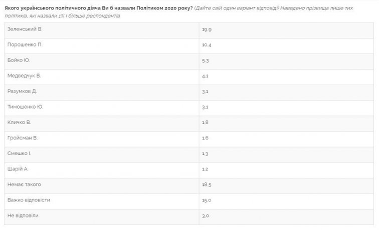 Также в этом году лишь 20% респондентов назвали Зеленского «Политиком 2020 года», что более чем в два раза ниже в сравнении с концом 2019 года — 46% украинцев.