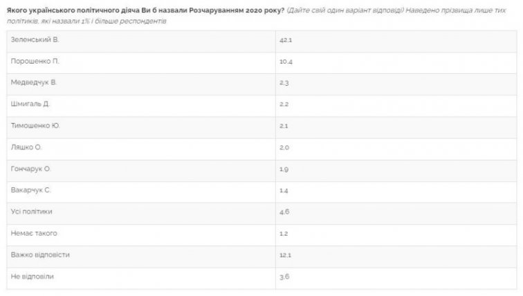 Медведчук, Шмыгаль, Тимошенко, Ляшко и Гончарук набрали в данной «номинации» по 2% голосов. Наименьше украинцев разочаровал Святослав Вакарчук — 1%.