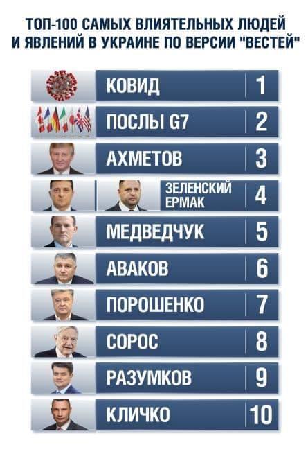 Издание "Вести" опубликовало рейтинг "Топ-100 самых влиятельных людей и явлений в Украине". Впервые рейтинг возглавил не человек, а явление, с которым в 2020 году столкнулся весь мир – коронавирус. Второе место в рейтинге заняли послы стран G7, на третьей строчке - олигарх Ринат Ахметов. Четвертую позицию рейтинга разделили между собой сразу два человека: президент Владимир Зеленский и глава его Офиса Андрей Ермак. На пятом месте - председатель политсовета "Оппозиционной платформы – За жизнь" Виктор Медведчук.