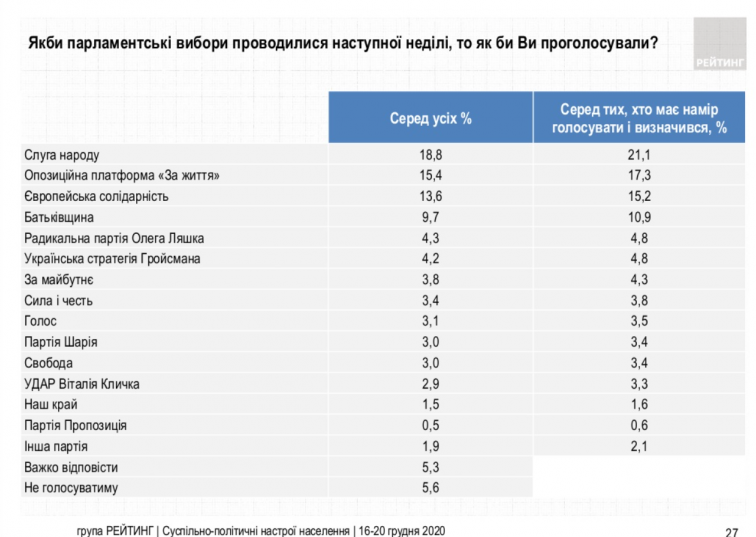 Если бы в ближайшее воскресенье в Украине проходили выборы в Верховную Раду, то в парламент прошли бу всего четыре партии: "Слуга народа", "Оппозиционная платформа - За жизнь", "Европейская солидарность" и "Батькивщина". Такие данные опроса украинцев опубликованы на сайте Соцгруппы "Рейтинг".