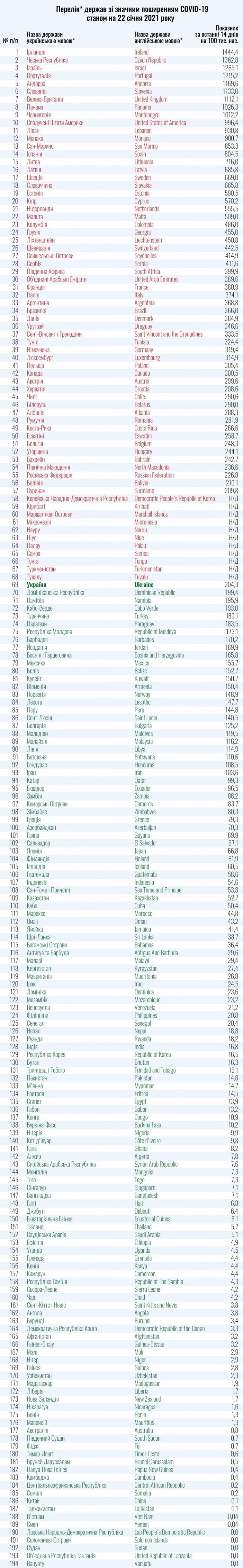 По состоянию на 22 января Украина оказалась на 69 месте и открывает список государств "зеленой зоны". В течение последних 14 дней в стране отметка достигает 204,3.