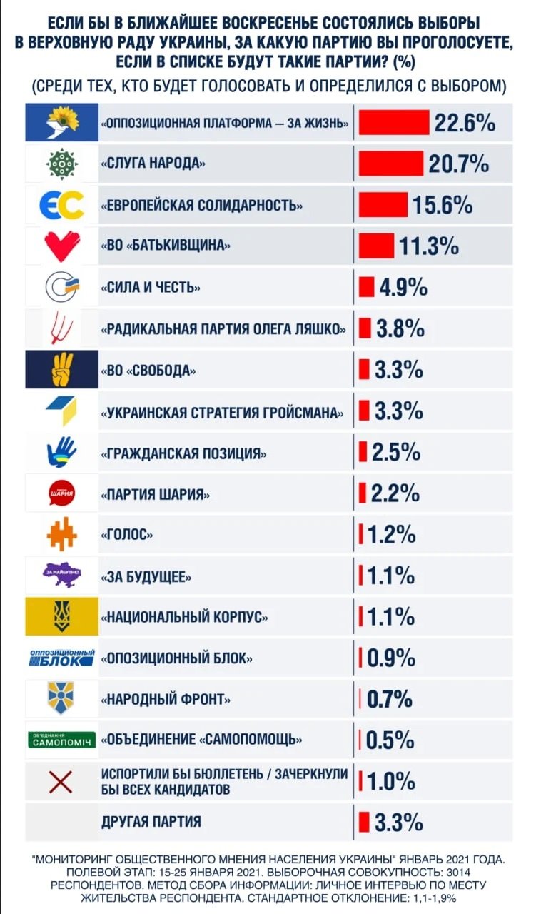 Если бы парламентские выборы на Украине состоялись в ближайшее воскресенье, то в Верховную раду с наибольшим количеством голосов прошла бы партия «Оппозиционная платформа — За жизнь» (22,6%).