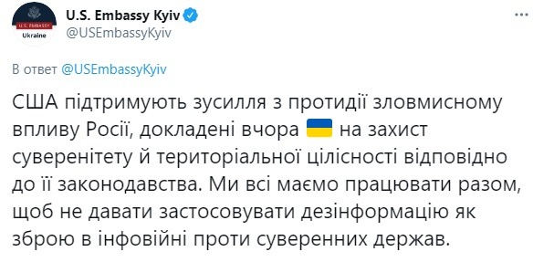 «США поддерживают усилия по противодействию злонамеренному влиянию России, приложенные вчера Украиной на защиту суверенитета и территориальной целостности в соответствии с ее законодательством. Мы все должны работать вместе, чтобы не давать применять дезинформацию как оружие в информвойне против суверенных государств», - подчеркивается в сообщении.
