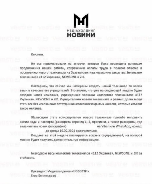 В опубликованном журналистами письме от президента медиахолдинга «Новости» Егора Бенкендорфа к сотрудникам закрытых каналов указывается, что новая компания будет создана уже на следующей неделе (с 15 февраля). Журналистов, которые хотят стать соучредителями, просят до 10 февраля предоставить документы и персональные данные.