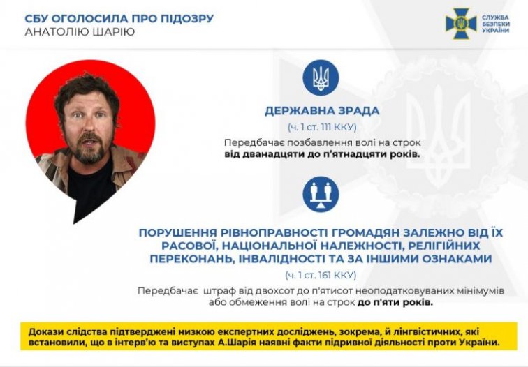 Служба безопасности Украины сегодня официально сообщила об обвинении живущего в Испании блогера и новоиспеченного политика Анатолия Шария в государственной измене. По этой статье уголовного кодекса предусматривается наказание до 15 лет тюрьмы.
