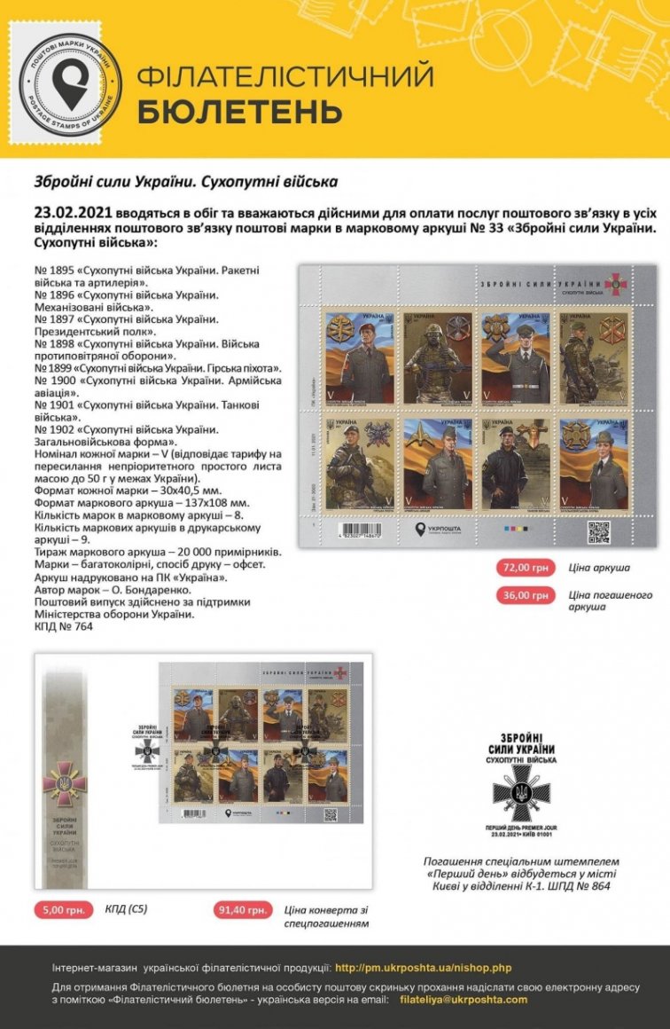 23 февраля в Украине планируется ввести в оборот почтовые и военные марки под названием «Вооруженные силы Украины. Сухопутные войска». Соответствующая информация указана в филателистическом бюллетене.