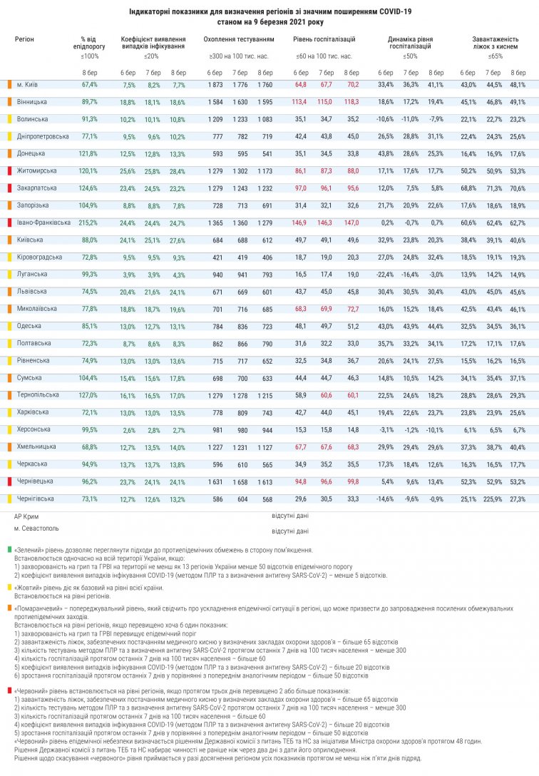 Показатель госпитализаций больных с COVID-19, при определенном уровне в 60 на 100 тыс. населения, превышен в 9 регионах - в г. Киев (70,2), Винницкой (118,3), Житомирской (88), Закарпатской (95,6), Ивано-Франковской (147), Николаевской (72,7), Тернопольской (60,1), Хмельницкой (68,3) и Черновицкой (99,8) областях.