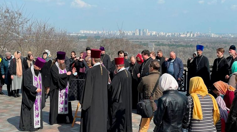 Прихожане Украинской православной церкви направляются на Банковую, чтобы вручить Офису президента обращение с требованием отменить закон, обязывающий переименовать УПЦ. Перед этим верующие провели молебен на Владимирской горке в Киеве.