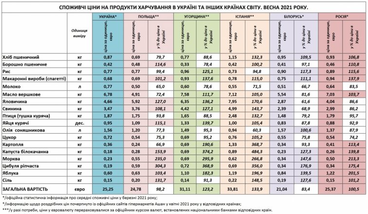 В Венгрии дешевле, чем в Украине стоит хлеб, мука, молоко, курятина, подсолнечное масло, сахар, соль, в Испании - рис, молоко, подсолнечное масло, в Белоруси - мука, молоко, говядина, свинина, яйца, сахар и др, в России — молоко, мясо, яйца, сахар, подсолнечное масло. Набор из базовых 18 продуктов в Белоруси обойдется на 16,6% дешевле, чем у нас, а в России — на 0,5% дороже. При этом на среднюю зарплату в Белоруси можно купить 19,4 таких продуктовых набора, в России 21,9, а в Украине - только 14,7.