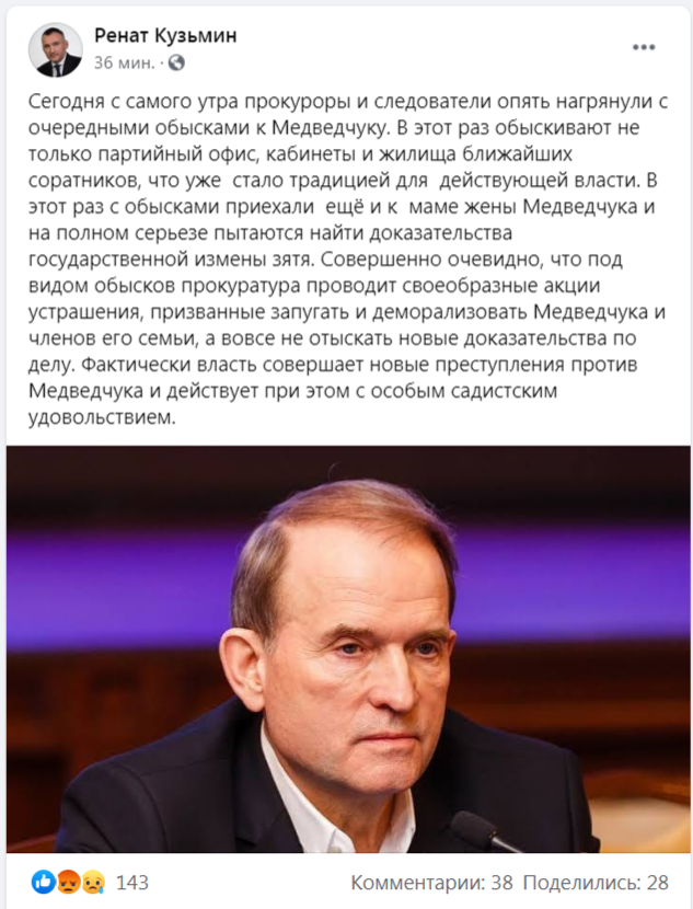 «Сегодня с самого утра прокуроры и следователи опять нагрянули с очередными обысками к Медведчуку. В этот раз обыскивают не только партийный офис, кабинеты и жилища ближайших соратников, что уже стало традицией для действующей власти. В этот раз с обысками приехали еще и к маме жены Медведчука и на полном серьезе пытаются найти доказательства государственной измены зятя», - написал Кузьмин в соцсетях.