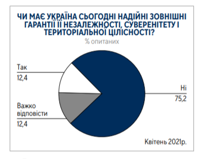 По данным исследования, три четверти (75%) граждан Украины дали отрицательный ответ на вопрос о наличии сегодня надежных внешних гарантий независимости, суверенитета и территориальной целостности Украины и только 12% — положительный.
