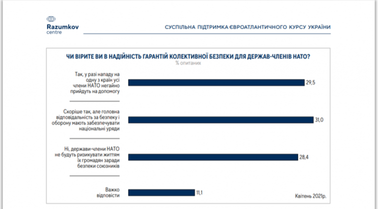 На вопрос «Верите ли вы в надежность гарантий коллективной безопасности для стран-членов НАТО?», лишь 29,5% ответили утвердительно, полагая, что «в случае нападения на одну из стран все члены НАТО немедленно придут ей на помощь». 31% полагает, что это «скорее так», но основная ответственность за оборону ляжет на национальные правительства. 28,4% опрошенных не верят, что страны НАТО будут «рисковать жизнью своих граждан ради безопасности союзников», 11% - затруднились с ответом.