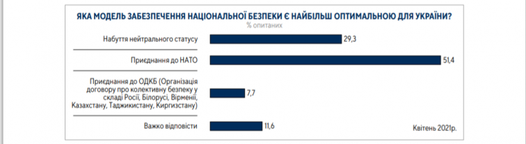 Вместе с тем, из предложенных вариантов наиболее оптимальной модели обеспечения национальной безопасности большинство (51%) опрошенных выбрали присоединение к НАТО и несколько менее трети (29%) — приобретение нейтрального статуса. ОДКБ в качестве альтернативы присоединению к НАТО выбрали лишь 8% опрошенных.