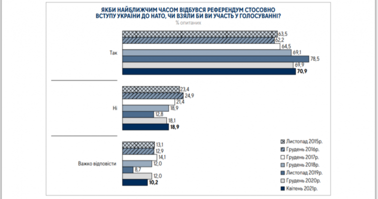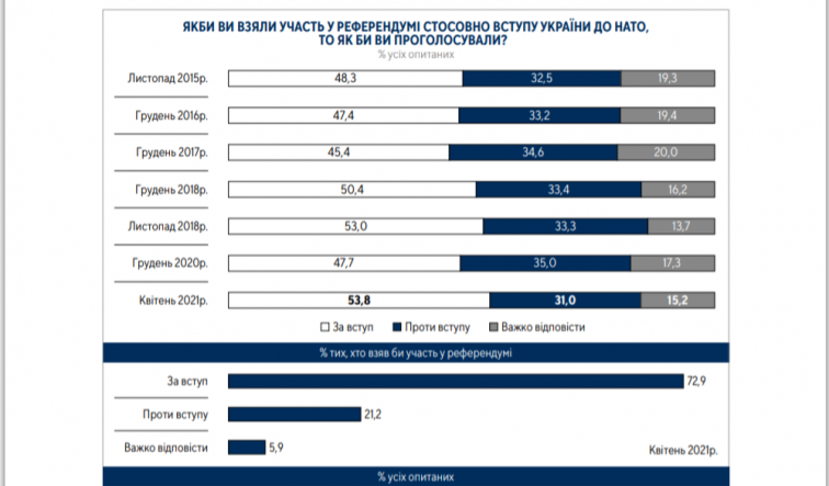 Если бы референдум о вступлении Украины в НАТО состоялся в ближайшее время, то в нем приняли бы участие подавляющее большинство (71%) опрошенных украинцев, из них 72,9% поддержали бы вступление Украины в Альянс.