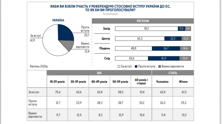 «Уровень общественной поддержки европейской интеграции традиционно несколько выше, чем евроатлантической. За вступление Украины в ЕС проголосовали бы 62% всех опрошенных, против вступления — 26%. При этом, доля сторонников вступления значительно превышает долю противников во всех возрастных категориях, независимо от пола респондентов. Баланс между "за" и "против" существенно меняется в зависимости от региона проживания, но остается в пользу сторонников вступления в ЕС», — сообщили также в Центре Разумкова.