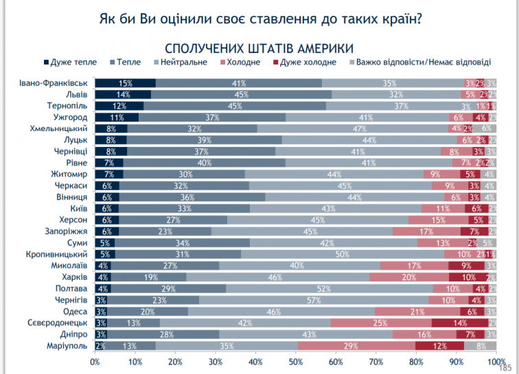К США украинцы явно благосклонно относятся на западе страны. В частности, Ивано-Франковске, Львове, Тернополе, Ужгороде, Луцке.