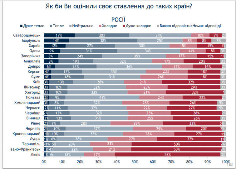 В центральной Украине - Киеве, Житомире, Хмельницком, Черкассах, Виннице, Чернигове, Кропивницком – отношение к РФ сдержанное и негативное, хотя и не без ответов «нейтрально» и «очень тепло».