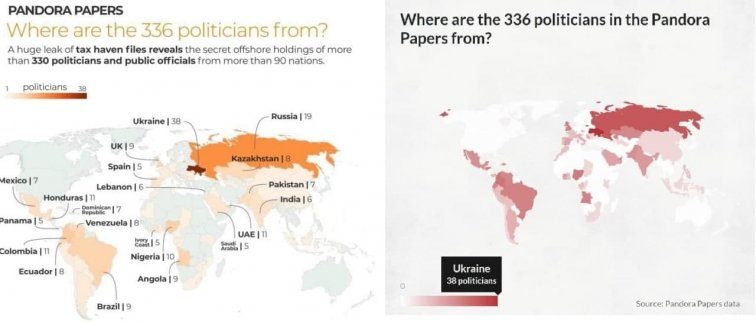 Согласно данным расследования Pandora Papers, в Украине 38 политиков имеют теневые доходы. Среди более чем 90 стран наша занимает первое место по количеству политиков, использующих офшорные схемы. На втором - Россия. Там 19 политиков имеют скрытые доходы.