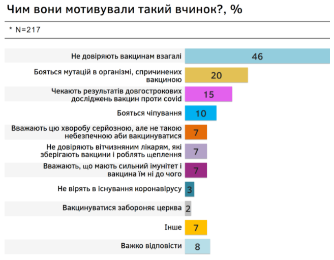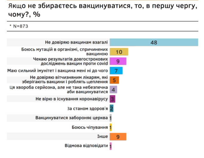Респонденты заявили, что в первую очередь не собираются делать прививку, потому что не доверяют препаратам (49%). 10% заявили, что боятся мутаций в организме, которые могут возникнуть после вакцины. Еще 9% ожидают долгосрочных исследований вакцин против коронавируса. 4% украинцев считают Сovid-19 не такой опасной болезнью, чтобы делать прививку, 3% не верят в существование коронавируса, еще 2% не готовы пока делать прививку по состоянию здоровья.