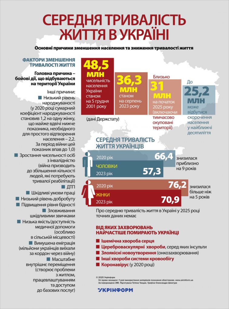 Согласно официальной статистике, если в 2020 году мужчины жили в среднем 66,4 года, то в 2023-м — только 57,3 года. Женская продолжительность жизни за тот же период сократилась с 76,2 до 70,9 лет. Таким образом, украинцы в среднем стали жить на 5–9 лет меньше, чем до начала полномасштабной войны.