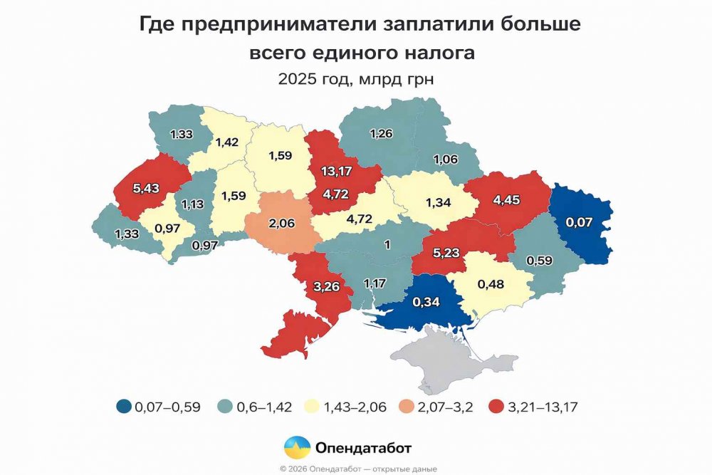 В региональном разрезе наибольшие поступления единого налога обеспечили ФЛП Киева — 13,2 миллиарда гривен, что составляет 22% от общей суммы. Далее следуют Львовская область с 5,4 миллиарда гривен, Днепропетровская — 5,2 миллиарда, Киевская — 4,72 миллиарда, Харьковская — 4,45 миллиарда и Одесская область — 3,2 миллиарда гривен.