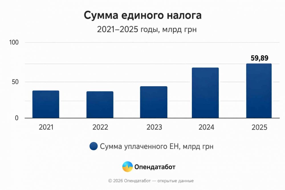 В 2025 году украинские ФЛП перечислили в бюджет 59,88 миллиарда гривен единого налога, что на 9% превышает показатель 2024 года. Об этом сообщает платформа «Опендатабот» со ссылкой на данные Государственной налоговой службы. Рост поступлений от ФЛП свидетельствует о сохранении активности малого бизнеса и увеличении налоговой нагрузки по отдельным группам предпринимателей.
