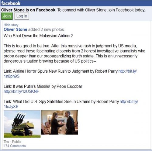 В своём Facebook режиссёр призвал ознакомиться с альтернативными точками зрения журналистов, которые «расследуют глубже, чем пропаганда четвёртой власти». В качестве примеров таких журналистов он назвал Роберта Перри и Пепе Эскобара, которые предполагают, что самолёт Boeing 777 был сбит украинскими военными.