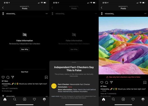 Социальная сеть пометила работу американского фотографа Тоби Харримана как фейк — мужчина сфотографировал холмы и с помощью редактора раскрасил их в неправдоподобно яркие цвета. Instagram уведомил фотографа о том, что это фото является неправдивым и помечено как «ложная информация».