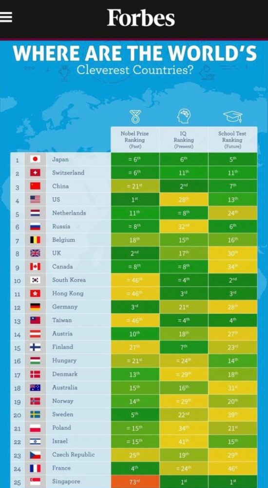Зато Китай получил 21 место по количеству полученных Нобелевских премий, но при этом по показателю текущего национального IQ Поднебесная занимает второе место, уступая Сингапуру, а по показателям успехов учеников своих школ 11 место.