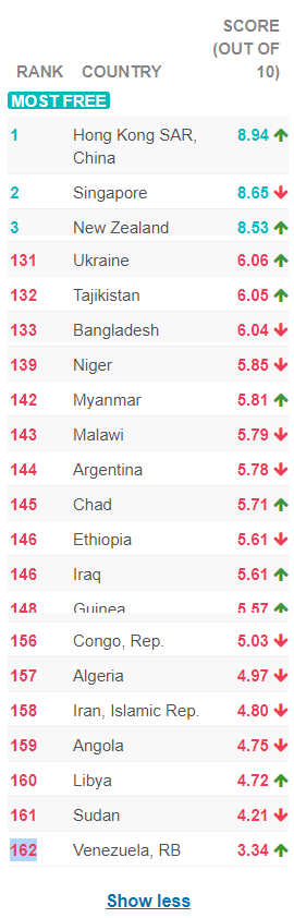 Украина выделена на карте красным цветом наряду с африканскими странами, Ираком, Ираном, Китаем, Индией и Венесуэлой, которая оказалась на последнем, 162 месте. Самым высоким уровень экономической свободы Украины был в 2011 и 2012 годах, однако за всю свою историю страна ни разу не покидала группу наиболее экономически несвободных стран. Соседями по рейтингу Украины являются Пакистан (129), Тунис (130) и Таджикистан (132).