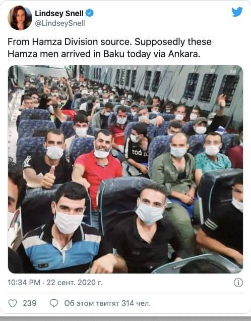 Журналистка Линдси Снелл, которую однажды похитили поддерживаемые Турцией террористы на севере Сирии, а затем бросили в турецкую тюрьму на два месяца после ее побега из Сирии, написала в Твиттере, что боевики из дивизии Хамза прибыли в столицу Азербайджана Баку через Турцию.