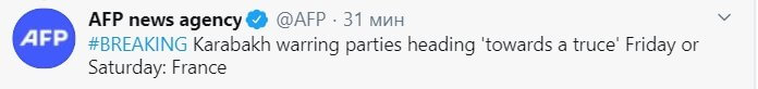 "Перемирие в Карабахе может быть заключено уже сегодня вечером или завтра" - говорится в сообщении.
