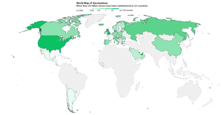 Карта вакцинирования в мире сейчас выглядит следующим образом.
