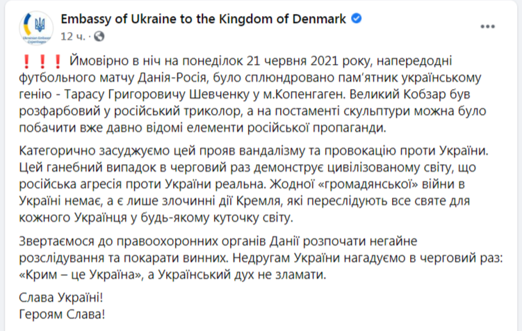 «Вероятно, в ночь на понедельник 21 июня, накануне футбольного матча Дания — Россия, было осквернено памятник украинскому гению — Тарасу Григорьевичу Шевченко в Копенгагене. Великий Кобзарь был раскрашен в российский триколор, а на постаменте скульптуры можно было увидеть уже давно известные элементы российской пропаганды», — возмутились в посольстве Украины.